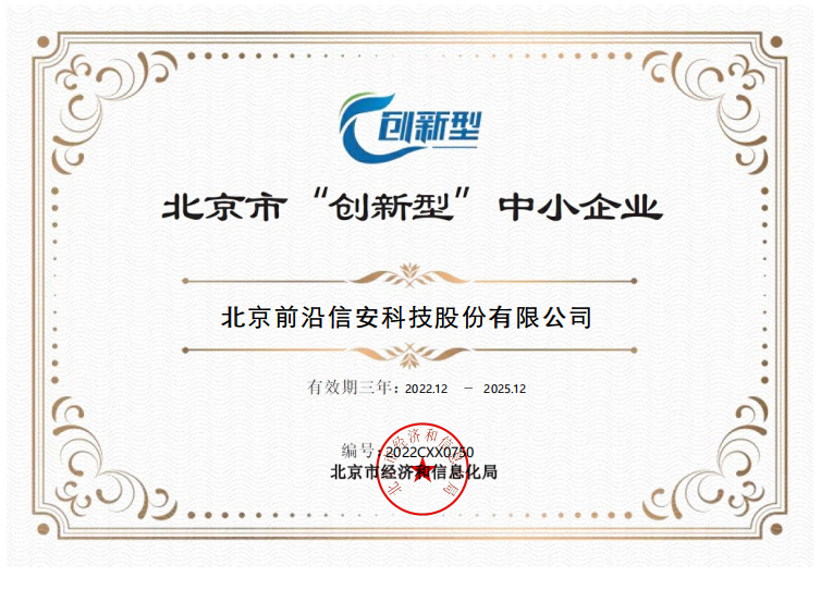 2023年4月,按照工業和信息化部《優質中小企業梯度培育管理暫行辦法》(工信部企業〔2022〕63號)、《北京市優質中小企業梯度管理實施細則》要求,前沿信安取得了2023年北京市“創新型”中小企業認定證書。