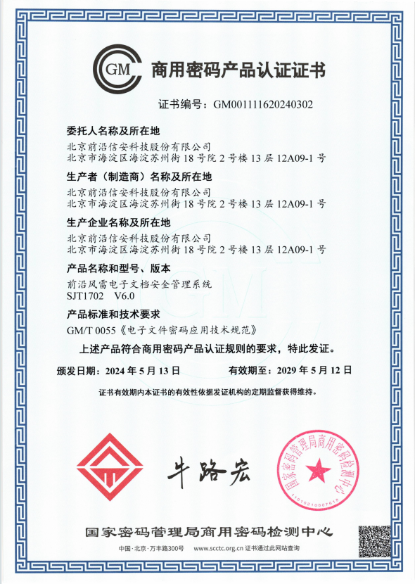 近日,前沿信安自研產品成功取得《商用密碼產品認證證書》,產品符合GM/T0065-2019《商用密碼產品生產和保障能力建設規范》、GM/T0066-2019《商用密碼產品生產和保障能力建設實施指南》,順利通過國家密碼管理局安全性審查,取得由國家密碼管理局商用密碼檢測中心頒發的《商用密碼產品認證證書》,再次彰顯了我公司在信息安全領域的創新實力和技術水平。